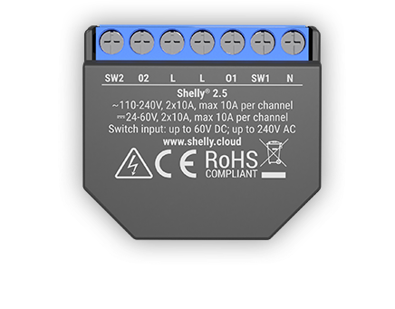 Nous avons développé Shelly 2.5 pour avoir une charge maximale de 2x2300W ou 2x10A. Mesure de puissance double indépendante pour chaque canal vous permettant de surveiller l’état et l’historique, ainsi que la consommation électrique actuelle et passée.